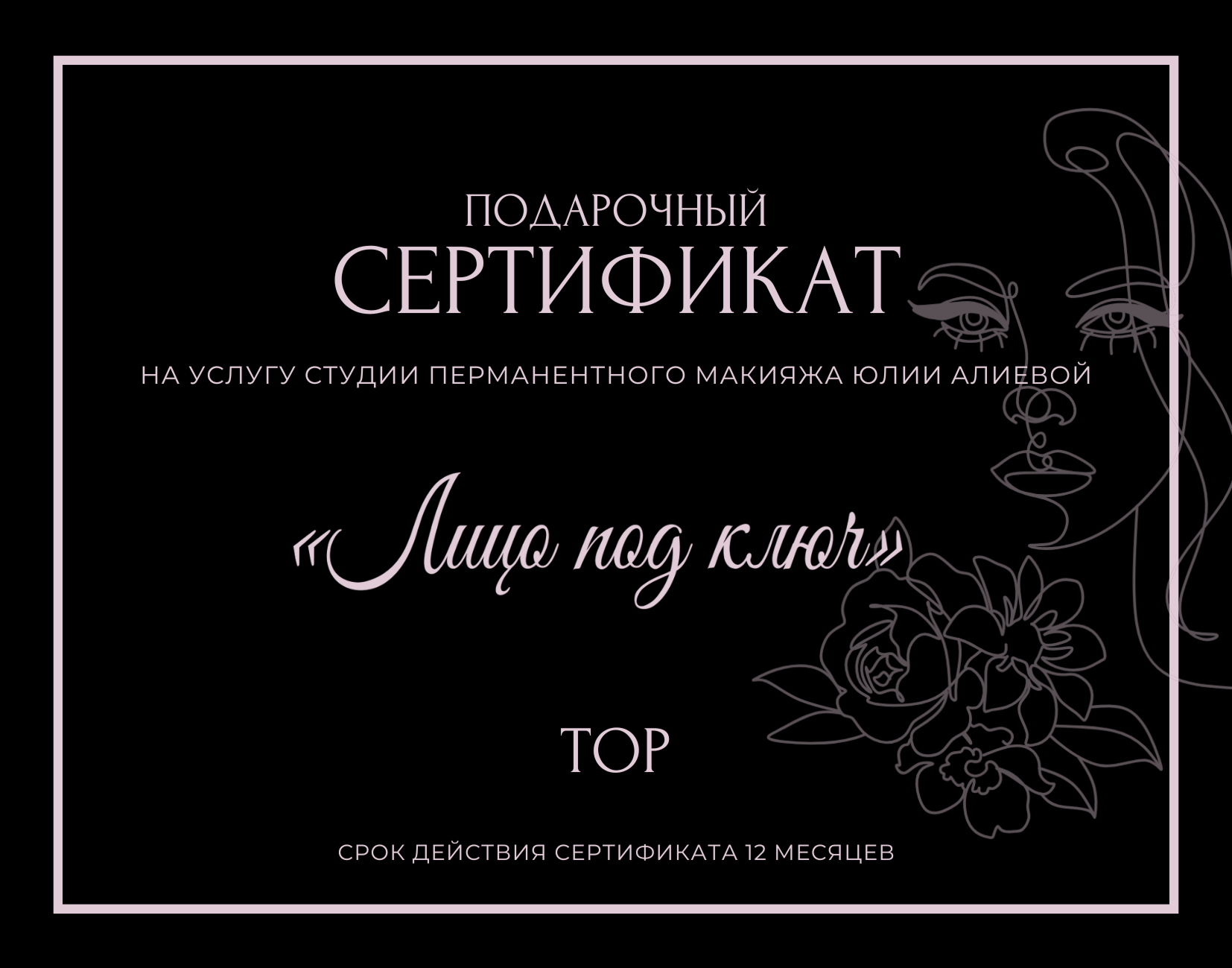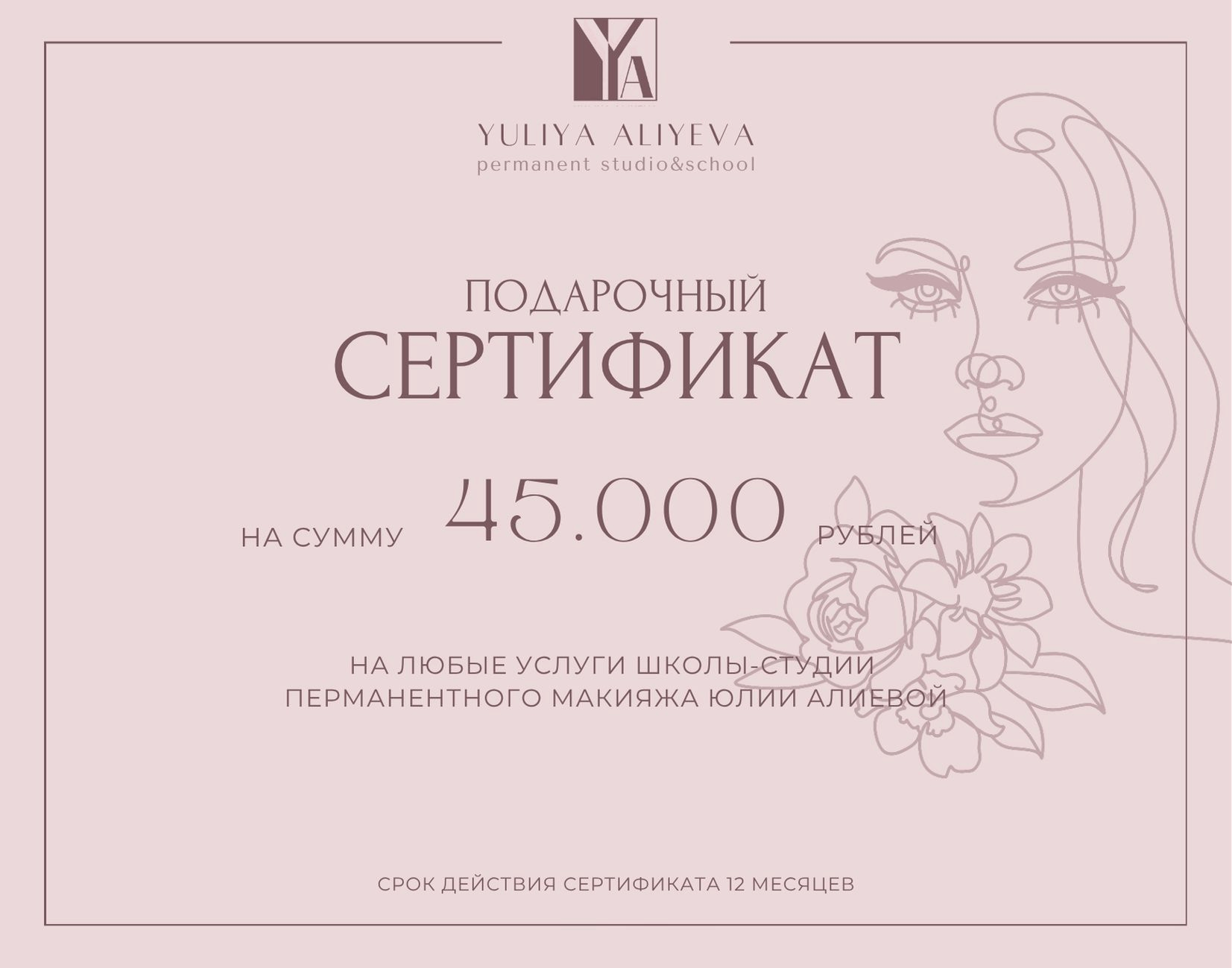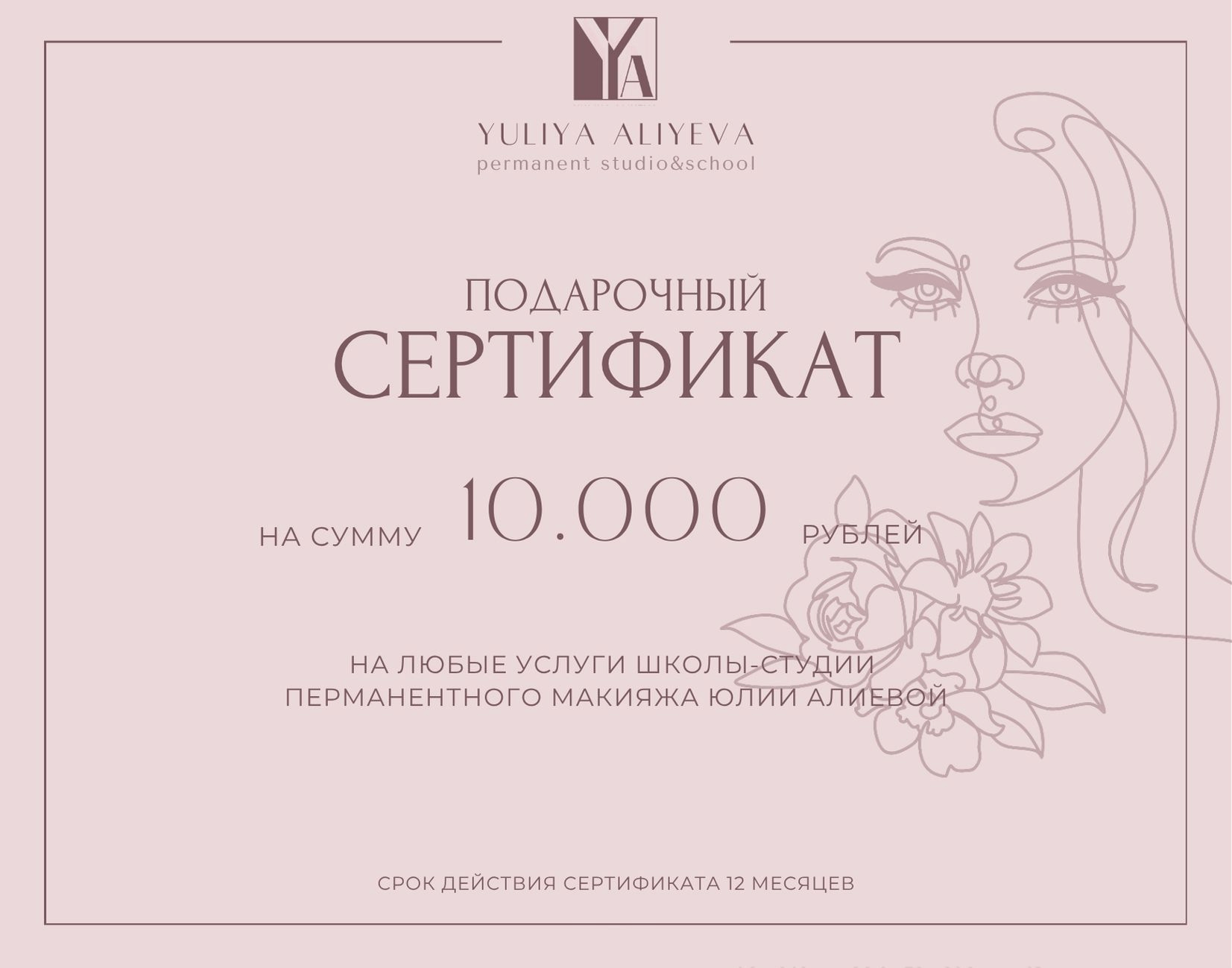 Данный сертификат дает право воспользоваться любой услугой, предоставляемой YULIYA ALIYEVA permanent studio&school, в пределах номинальной стоимости: перманентный макияж бровей/губ/век, коррекцию и обновление перманентного макияжа, перекрытие старого татуажа, удаление татуажа и тату неодимовым лазером и ремувером, карбоновый пилинг, массаж и обучение перманентному макияжу.